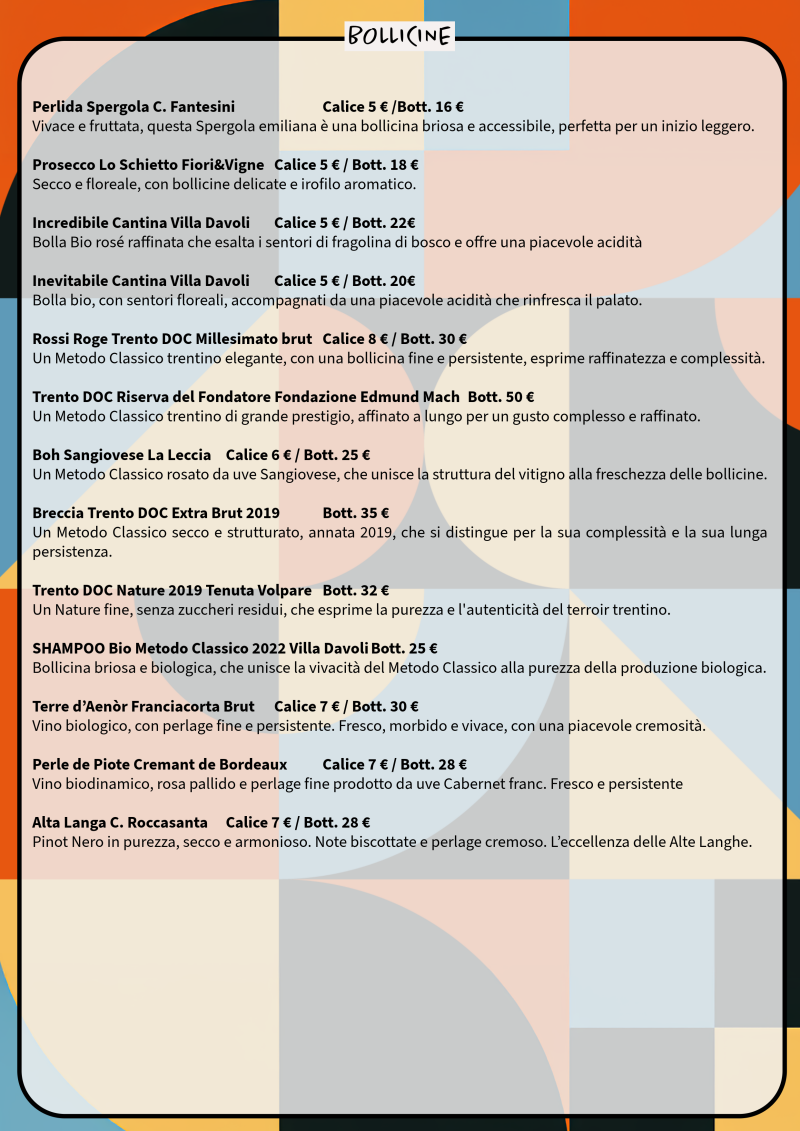 Ma non finisce qui. Affianchiamo una drink list con cocktail originali e stagionali, creati con spirito creativo e materie prime top. E per chi è zero alcol, abbiamo soft drink e alternative analcoliche ricercate di altissima qualità.